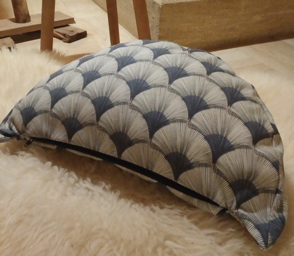 en forme de demi-lune, conçu spécialement pour procurer une assise aisée et soutenue. Housse lavable. Rembourrage de la housse intérieure en balle d’épeautre bio. * Possibilité de confection avec votre propre tissu *